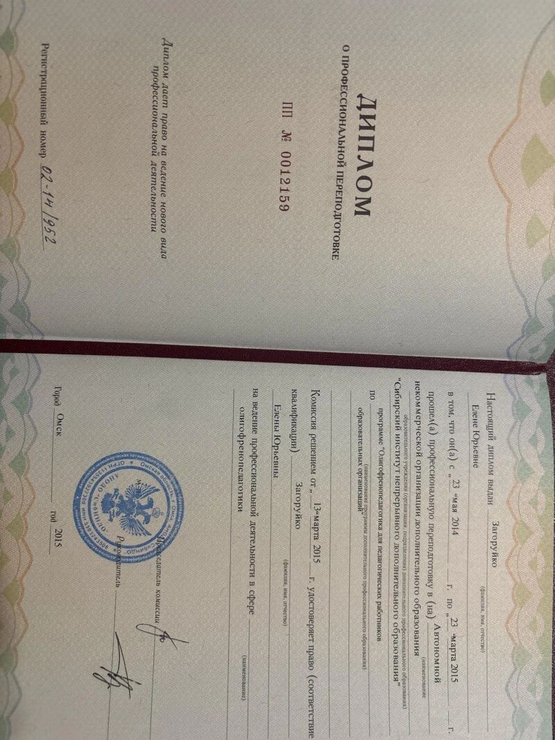 - Диплом о профессиональной переподготовке по программе Олигофренопедагогика, 2014–2015 гг.