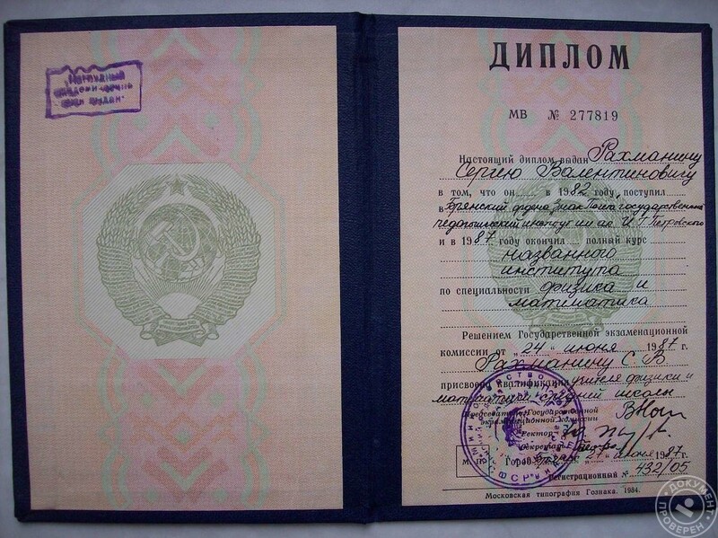 - Физико-математический факультет Брянского государственного педагогического института им. академика И.Г. Петровского, квалификация – учитель физики и математики, 1987 г.