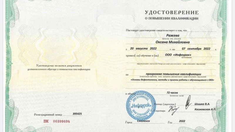 - ООО «Инфоурок», повышение квалификации, программа «Основы дефектологии, методы и приемы работы с обучающимися с ОВЗ», 2022 г.