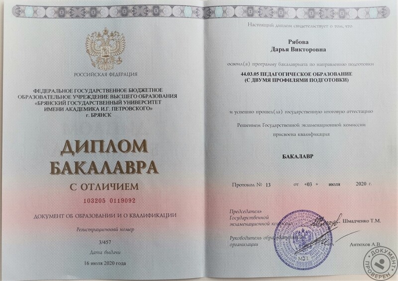 - БГУ им. академика И. Г. Петровского, факультет иностранных языков, кафедра английского языка и методики его преподавания, Педагогическое образование (Профиль подготовки «Иностранный язык (английский) и иностранный язык (немецкий)»), 2015–2020 гг.