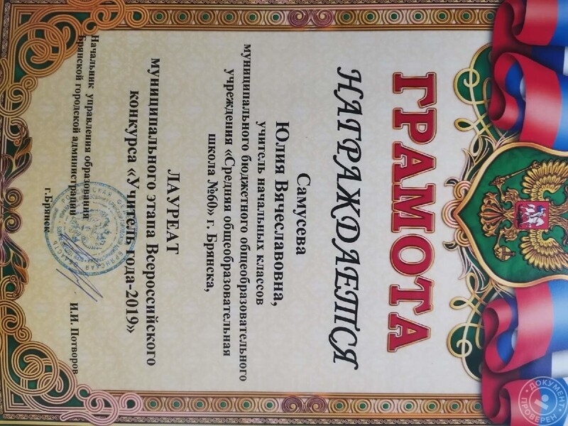 - Лауреат муниципального этапа Всероссийского конкурса «Учитель года-2019».