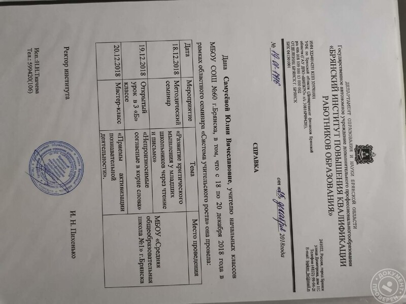 - Брянский институт повышения квалификации работников образования, областной семинар «Система учительского роста», 2018 г.