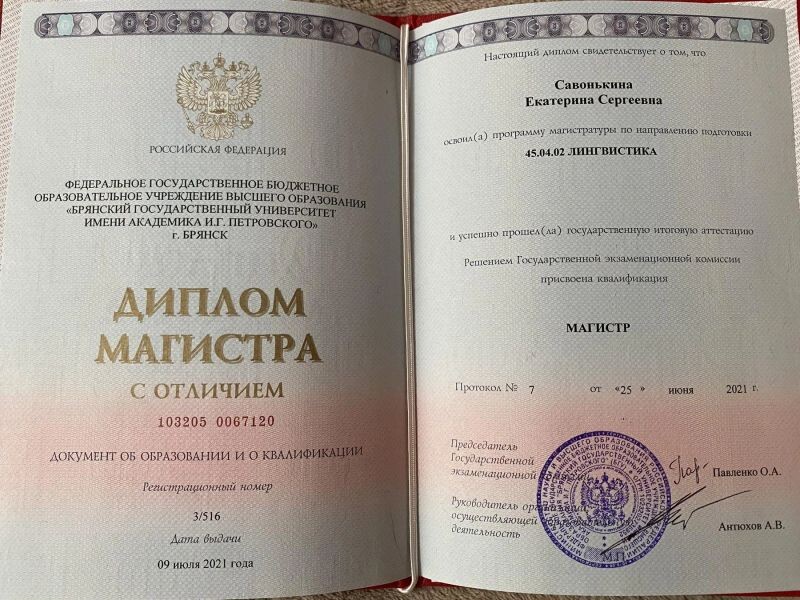- Брянский государственный университет им. академика И.Г. Петровского, факультет иностранных языков, направление — перевод и лингводидактика, магистр, диплом с отличием, 2019–2021 гг.