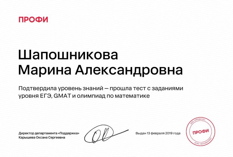 - Подтвердила уровень знаний — Прошла тест с заданиями уровня ЕГЭ, GMAT и олимпиад по математике (с 2019 г.).