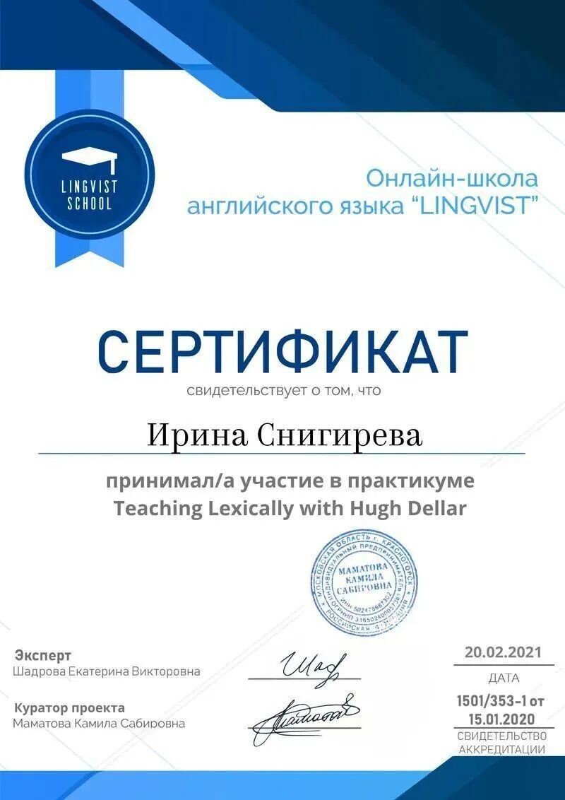- Онлайн-школа английского «LINGVIST», практикум «Teaching Lexically with Hugh Dellar», 2021 г.