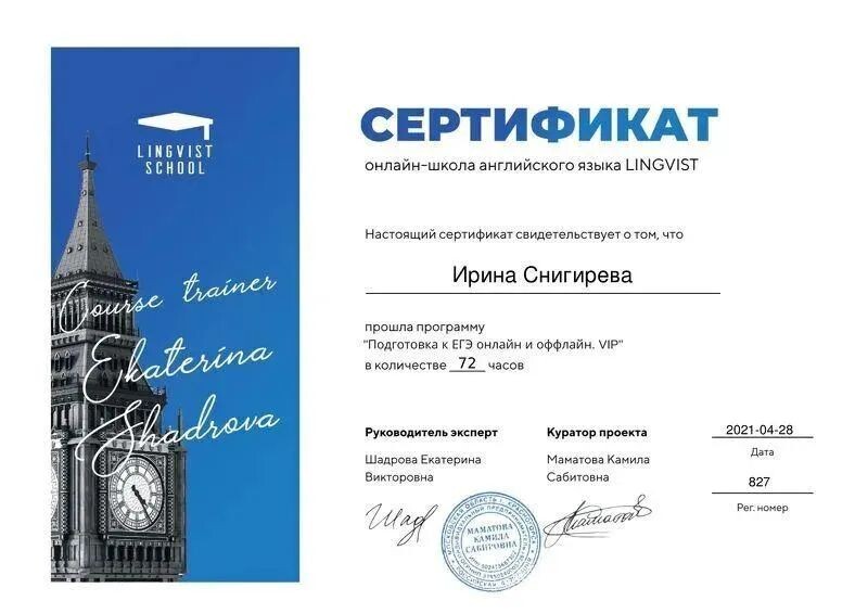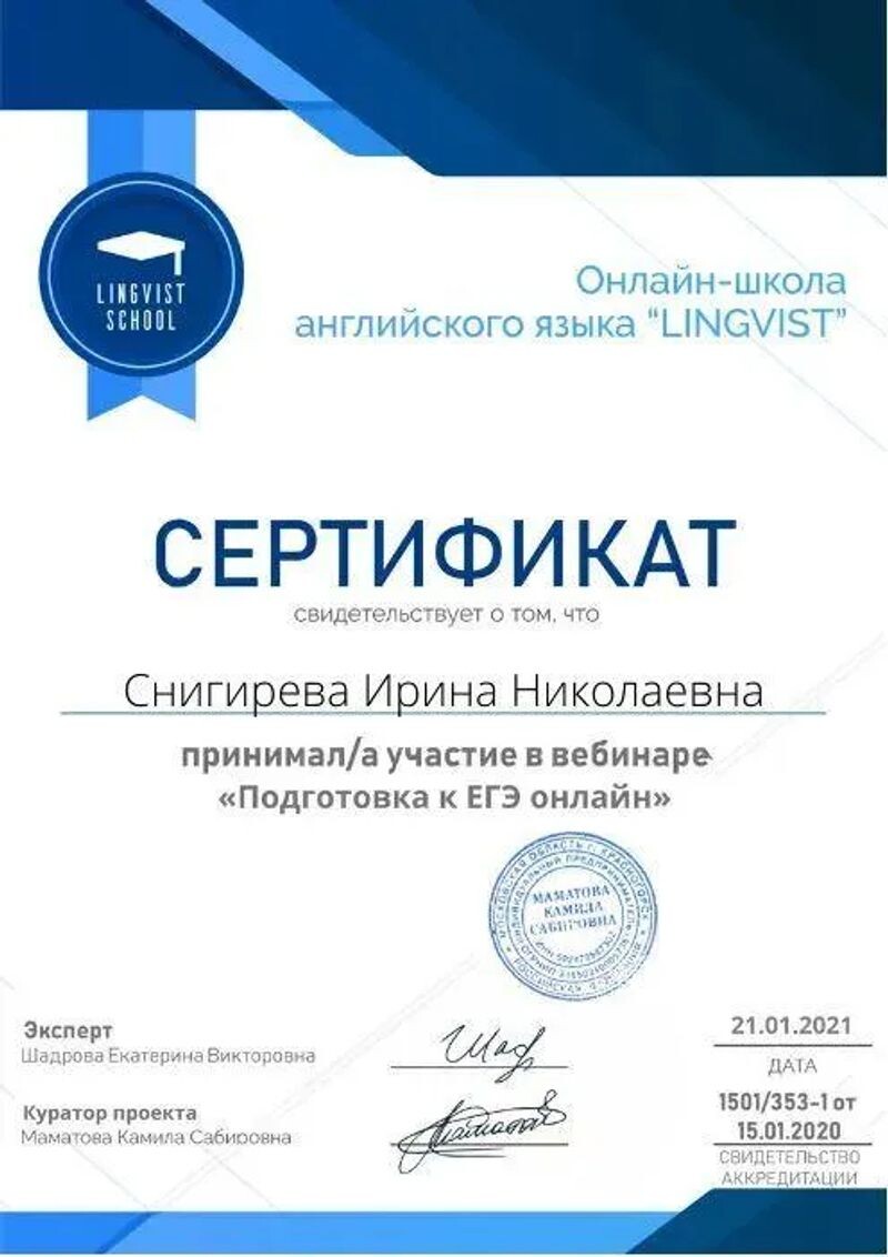 - Онлайн-школа английского «LINGVIST», программа «Подготовка к ЕГЭ онлайн и офлайн. VIP», 2021 г.