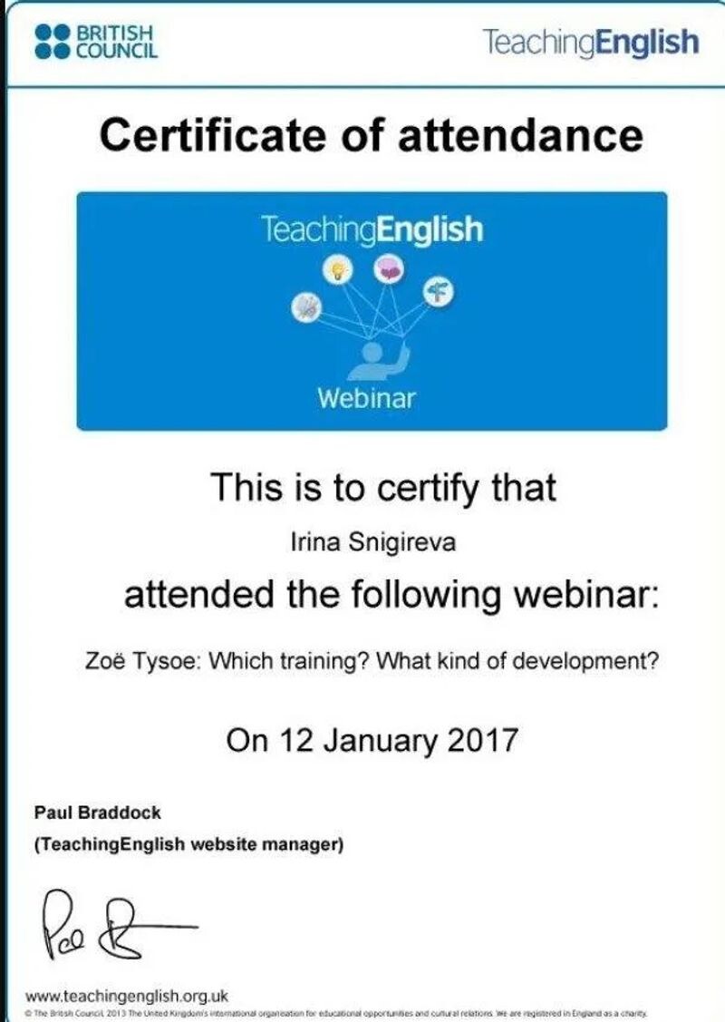 - Тренинговый центр PROFI.RU, вебинар «Подготовка к устной части ЕГЭ по иностранному языку», 2019 г.
