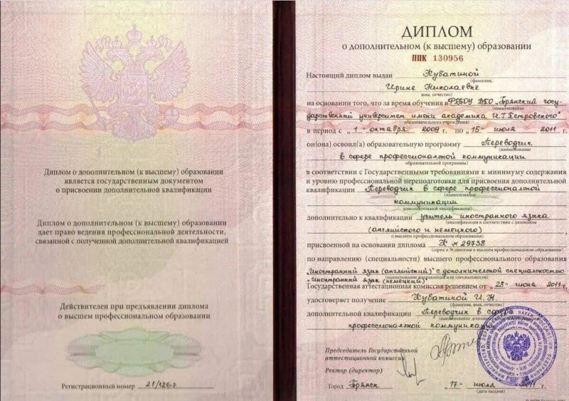 - Факультет иностранных языков Брянского государственного университета им. академика И.Г. Петровского, квалификация – преподаватель английского и немецкого языков, 2011 г.