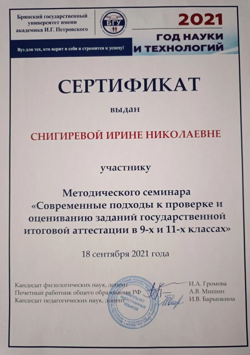 - Брянский государственный университет имени академика И.Г. Петровского, методический семинар «Современные подходы к проверке и оцениванию заданий государственной итоговой аттестации в 9-х и 11-х классах», участник, 2021 г.