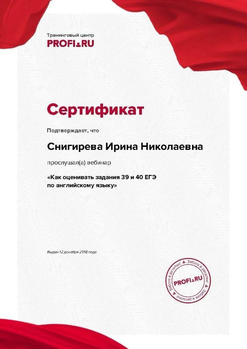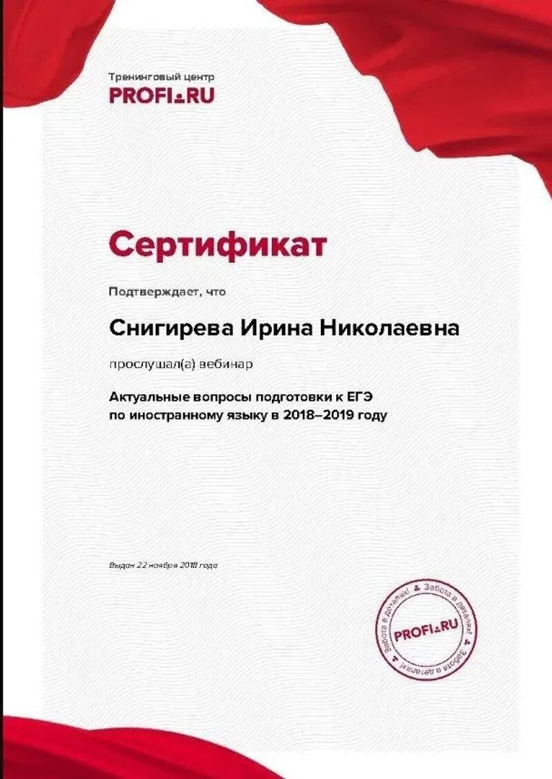 - Тренинговый центр PROFI.RU, вебинар «Актуальные вопросы подготовки к ЕГЭ по иностранному языку в 2018-2019 году».