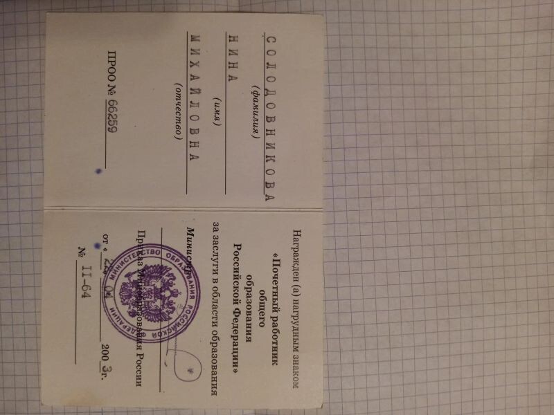 - Почётный работник общего образования Российской Федерации, за заслуги в области образования, 2003 г.