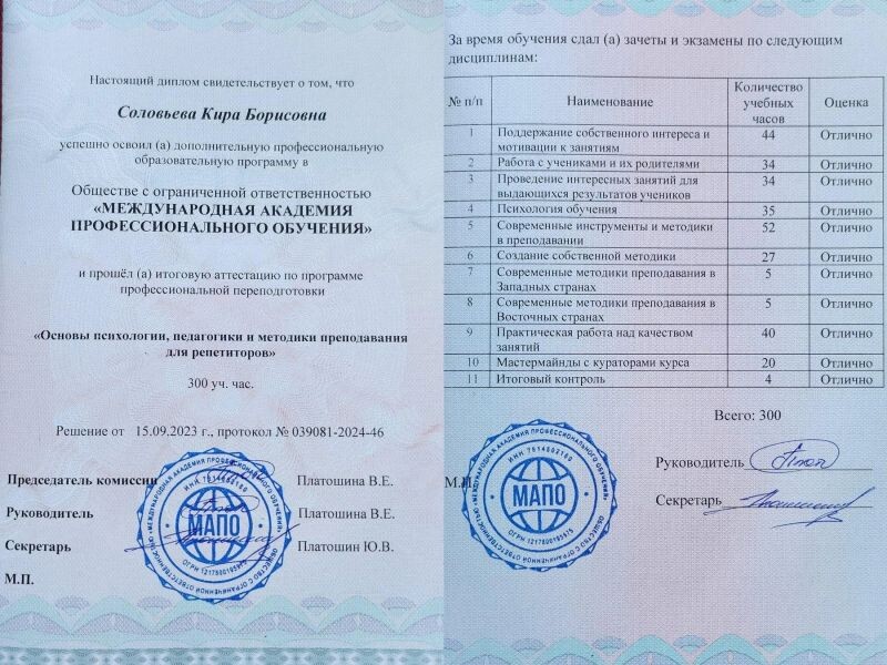 - ООО «Международная академия профессионального обучения», программа «Основы психологии, педагогики и методики преподавания для репетиторов», 2023 г.
