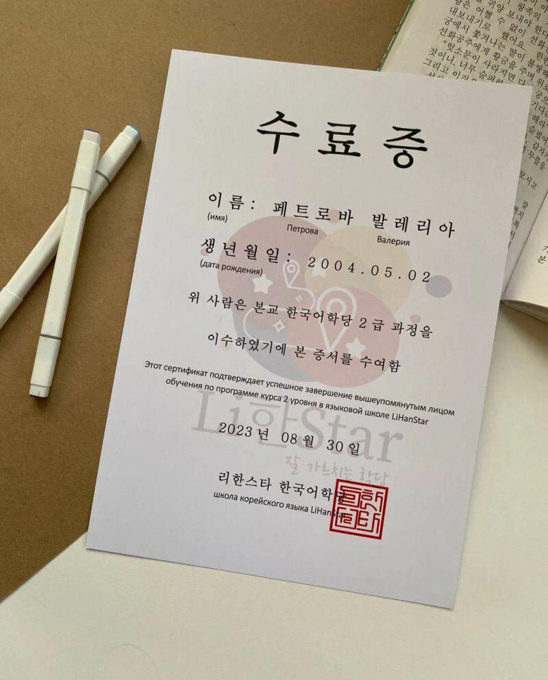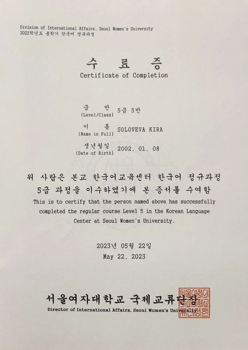 - Сеульский женский университет, курс корейского языка 5-го уровня, 2022–2023 гг.
