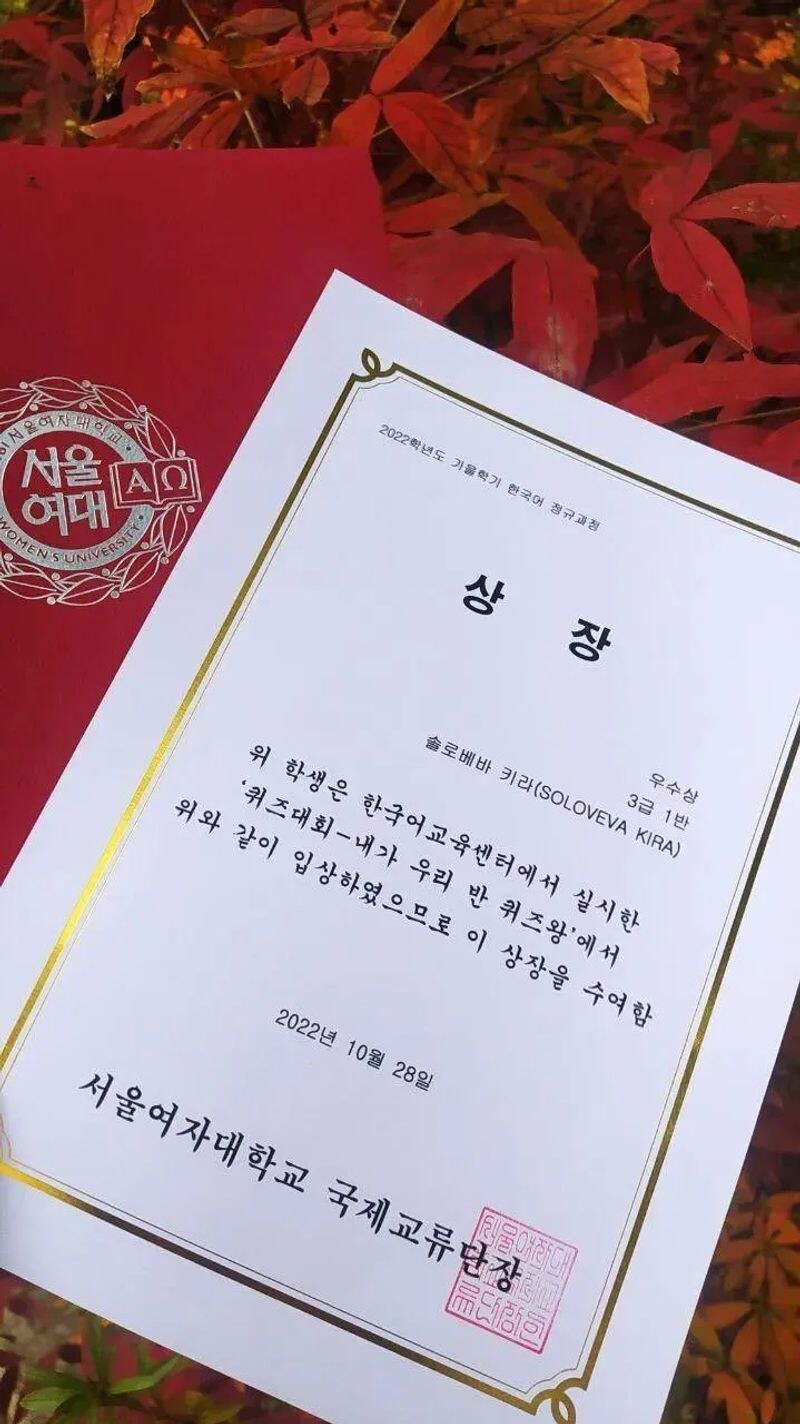 - Победа в конкурсе о культуре и быте Кореи, а также о корейском языке при университете Seoul Women's University, 2022 г.