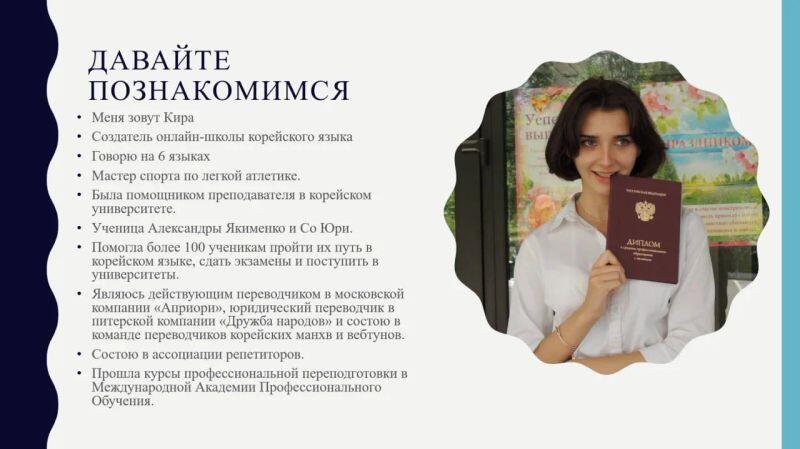 Кира Борисовна отличный учитель и человек! Материал объясняет очень просто и понятно, всегда помогает исправить мои ошибки, не засоряет презентации лишней информацией. В классе всегда царит дружественная атмосфера. Она дает доступ к карточкам со словами и картинками, что очень помогает запомнить их легко! Благодаря такому замечательному преподавателю, я даже не думаю остановиться в изучении корейского языка! Спасибо☺️