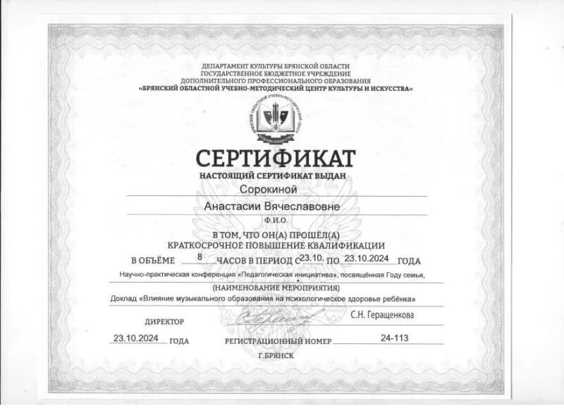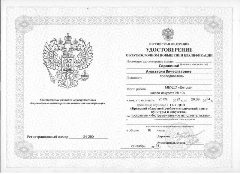 - Брянский областной учебно-методический центр культуры и искусства, повышение квалификации по программе «Инструментальное исполнительство», 2024 г.
