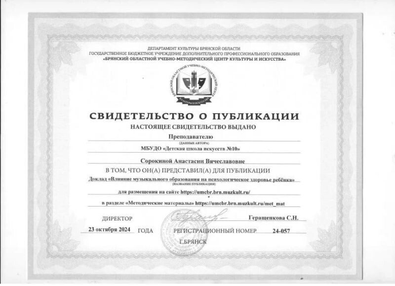 - Брянский областной учебно-методический центр культуры и искусства, Научно-практическая конференция «Педагогическая инициатива», посвящённая Году семьи, тема «Влияние музыкального образования на психологическое здоровье ребёнка», 2024 г.