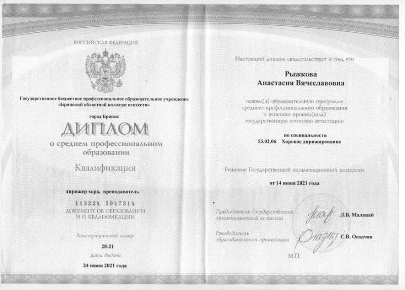 - Брянский областной колледж искусств, хоровое дирижирование, дирижёр хора, преподаватель, 2017–2021 гг.