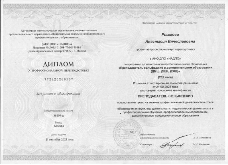 - Национальная академия дополнительного профессионального образования, профессиональная переподготовка по программе «Преподаватель сольфеджио в дополнительном образовании (ДМШ, ДШИ, ДХШ)», 2023 г.