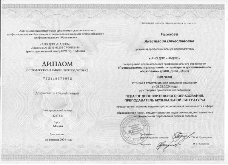 - Национальная академия дополнительного профессионального образования, профессиональная переподготовка по программе «Преподаватель музыкальной литературы в дополнительном образовании (ДМШ, ДШИ, ДХШ)», 2023–2024 гг.