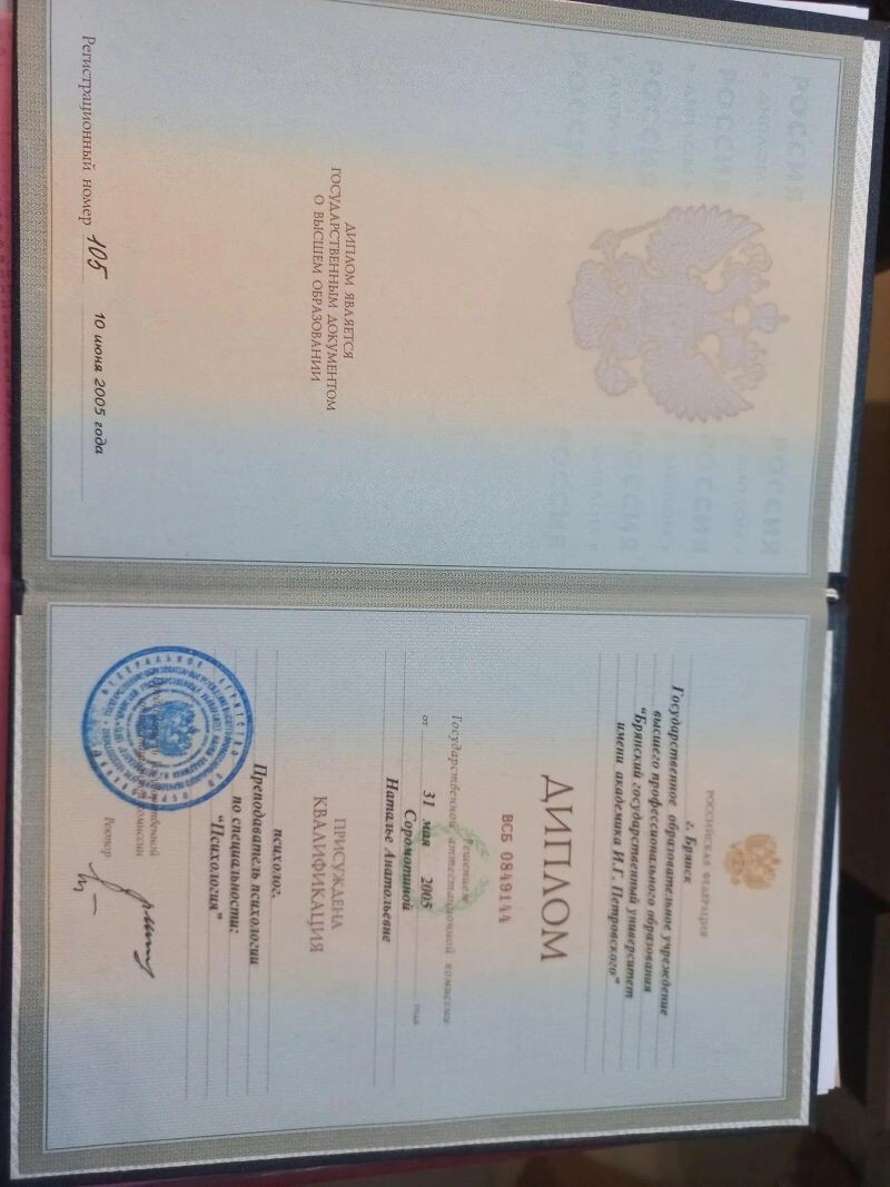 - Брянский государственный университет им. академика И.Г. Петровского, психолог, преподаватель психологии, 2001–2005 гг.