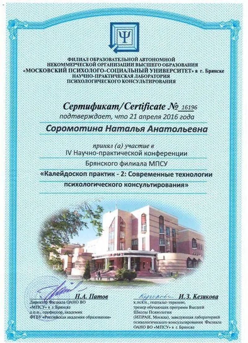 - Брянский филиал МПСУ, IV Научно-практическая конференция «Калейдоскоп практик-2: современные технологии психологического консультирования», 2016 г.