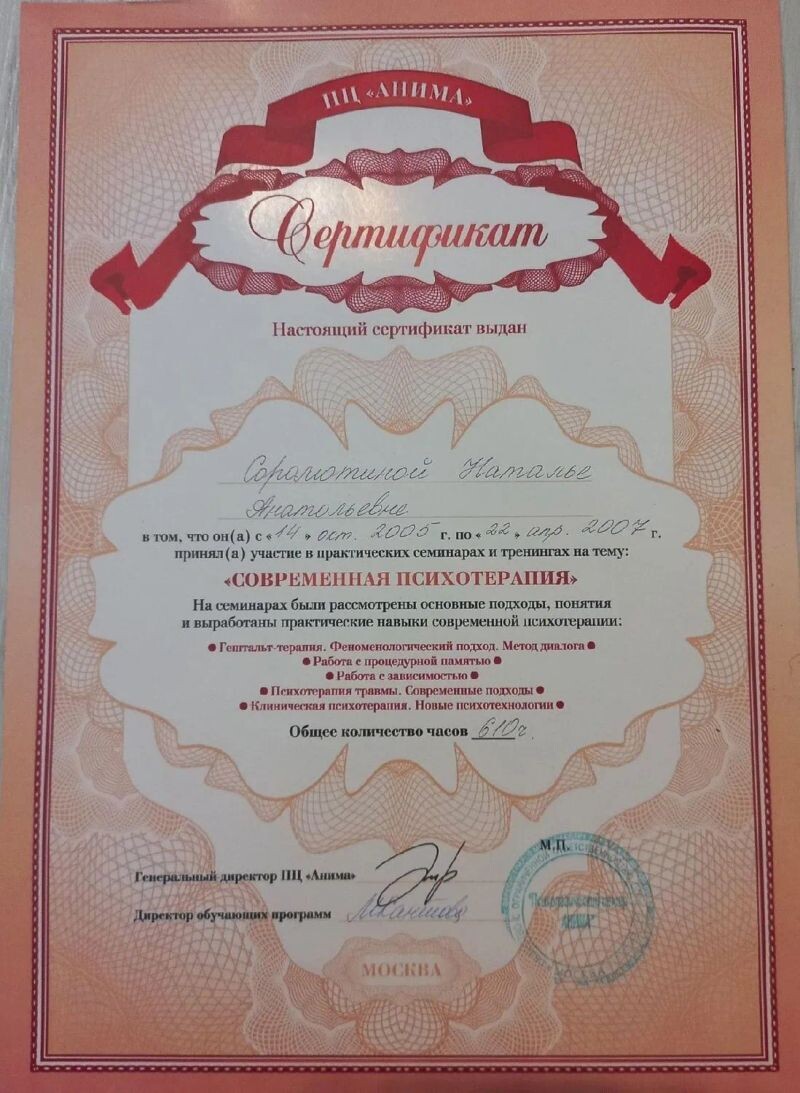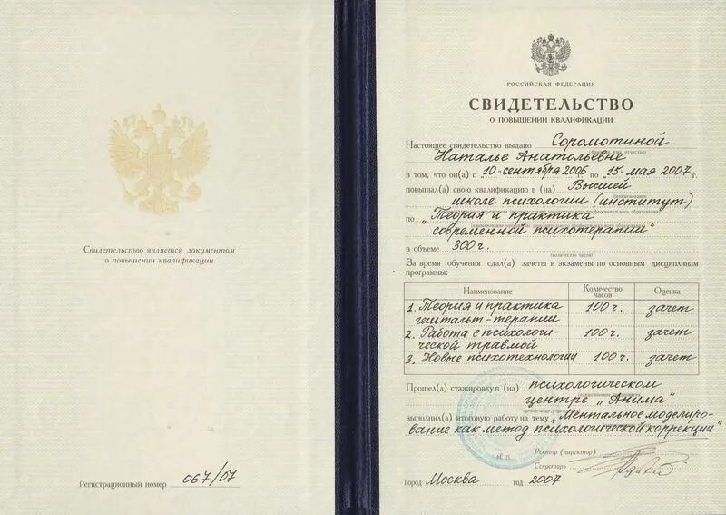 - Высшая школа психологии (институт), гештальт-терапия, теория и практика современной психотерапии, 2006–2007 гг.