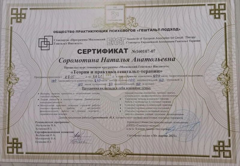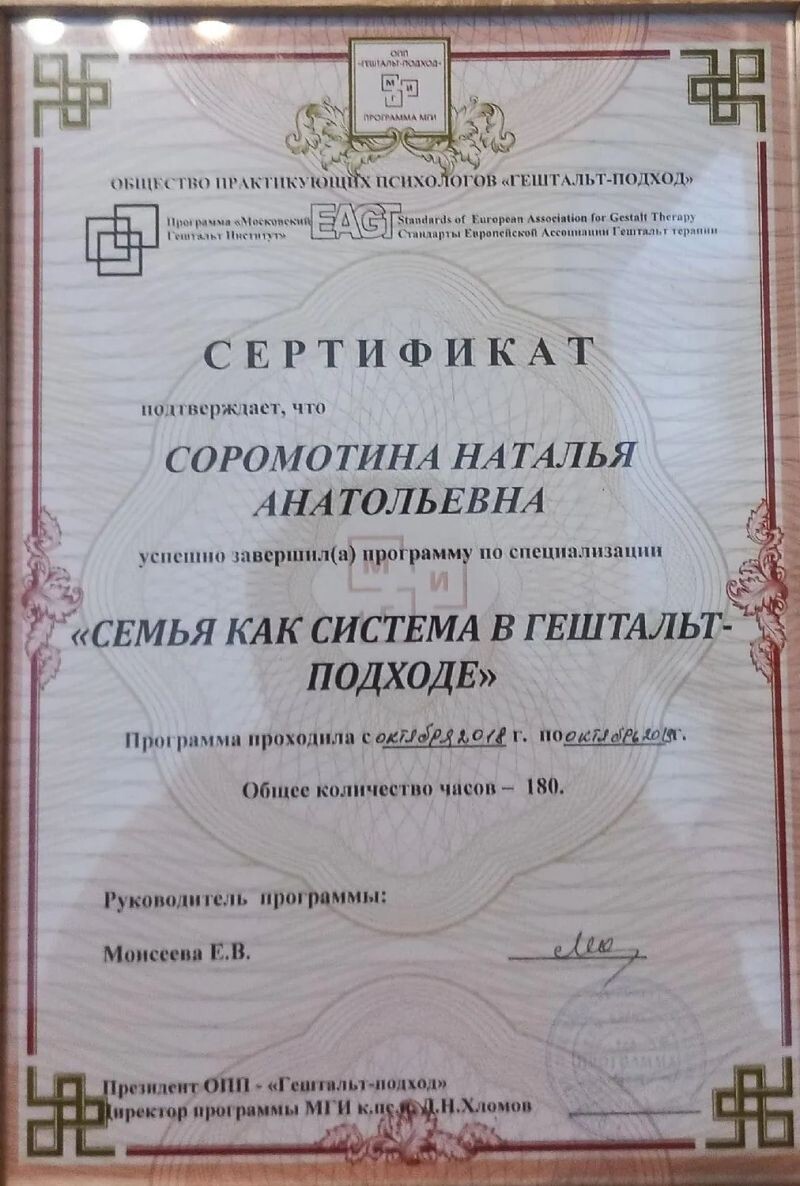 - МГИ, семья как система в гештальт-подходе (180 ч.), 2018–2019 гг.