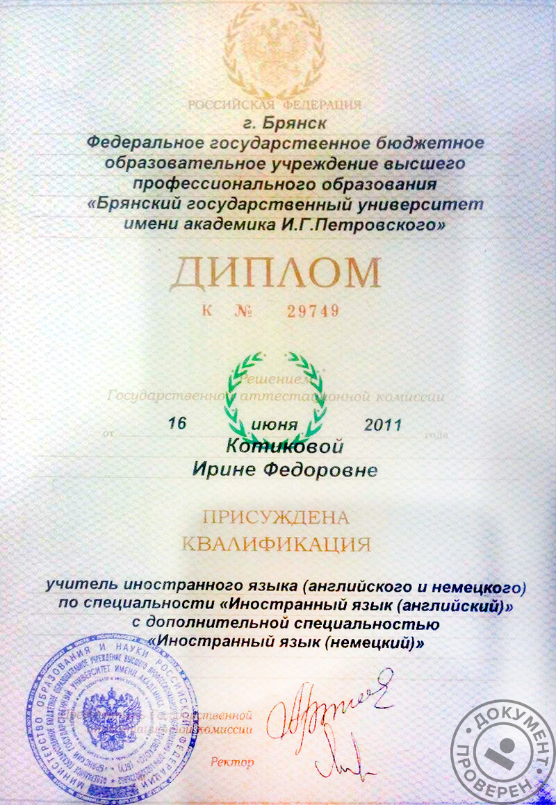 - Окончила Брянский государственный университет им. академика И.Г. Петровского, факультет иностранных языков, специальность – учитель английского и немецкого языков (2011 г.); профессиональная переподготовка по программе: «Переводчик в сфере профессиональной коммуникации» (2013 г.).