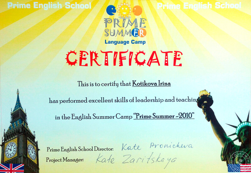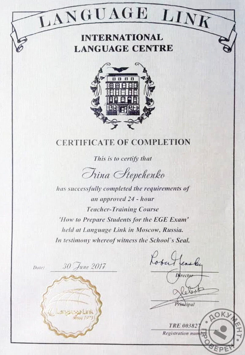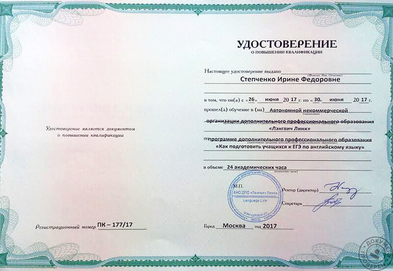 - Language Link, International Language Centre, курс по программе дополнительного профессионального образования «Как подготовить учащихся к ЕГЭ по английскому языку» (2017 г.).