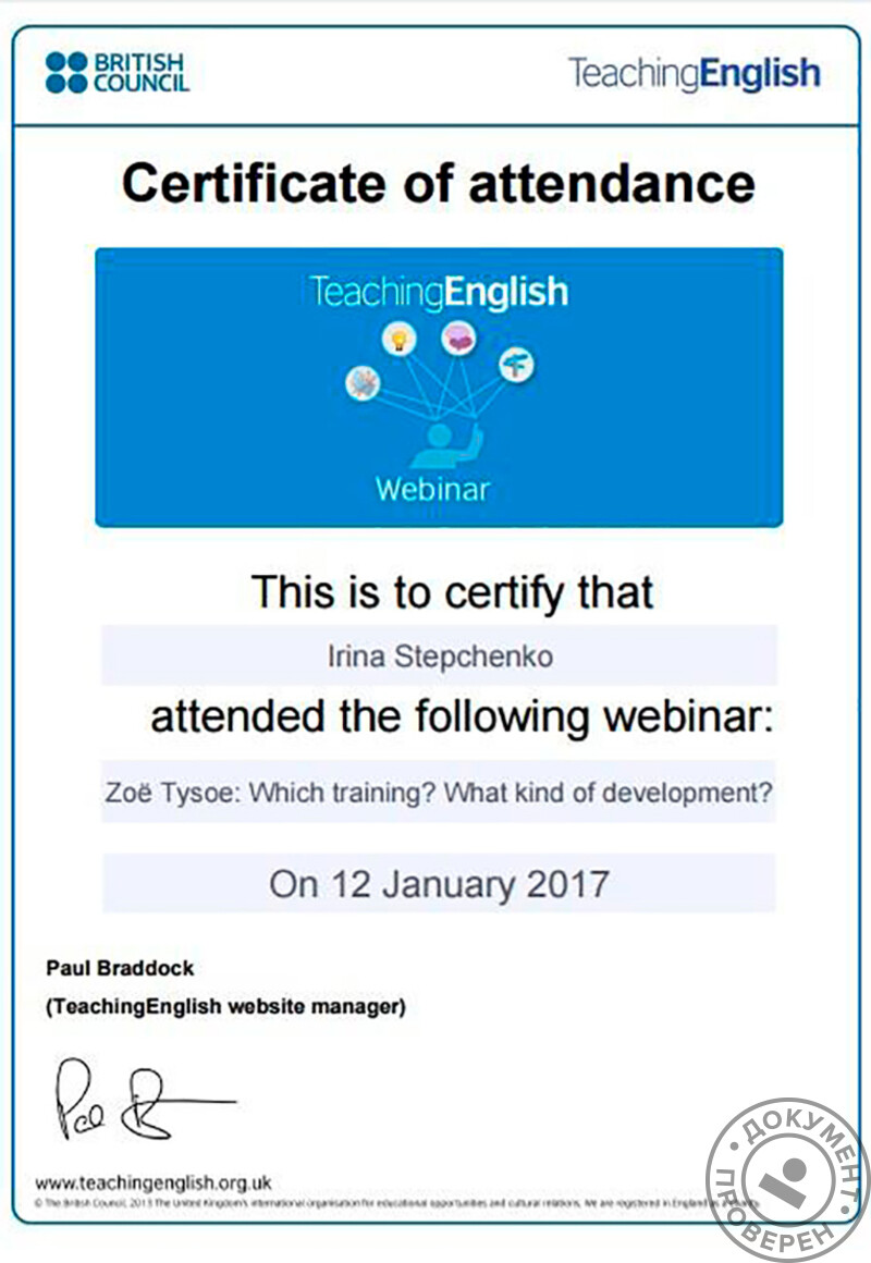 - Участвовала в вебинаре «ЕГЭ по английскому языку: практическая подготовка» (2017 г.).