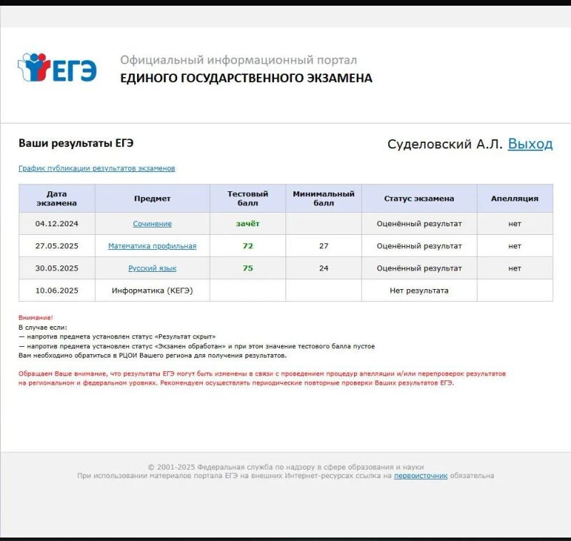 - ЕГЭ по профильной математике — 72 балла (с 2025 г.).