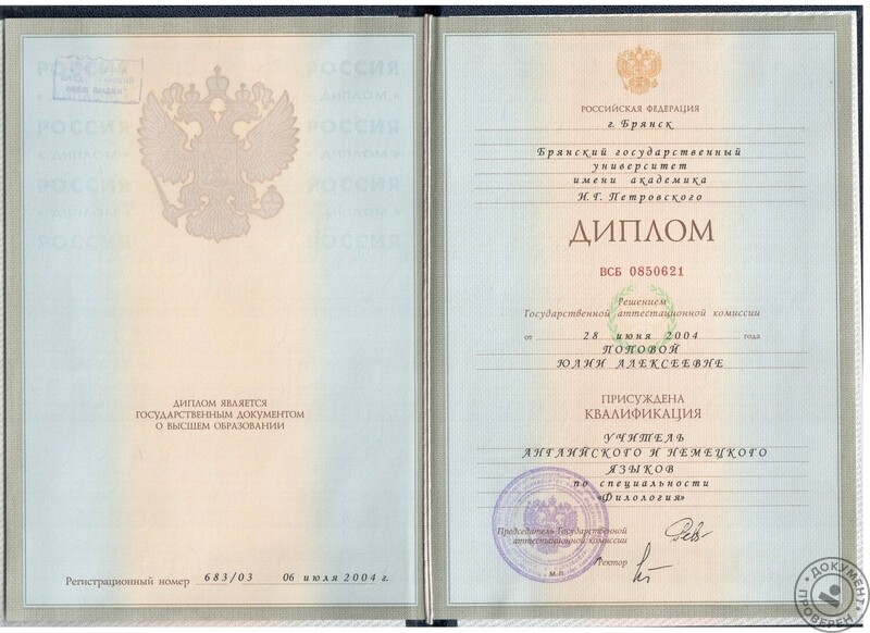 - БГУ им. академика И.Г. Петровского, факультет иностранных языков, квалификация – учитель английского и немецкого языков, 1999–2004 гг.