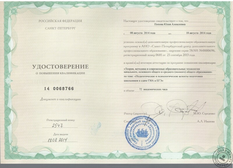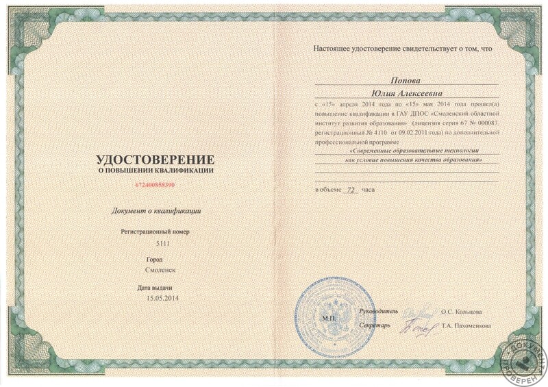 - Повышение квалификации «Аспекты подготовки школьников к сдаче ГИА и ЕГЭ», 2014 г.