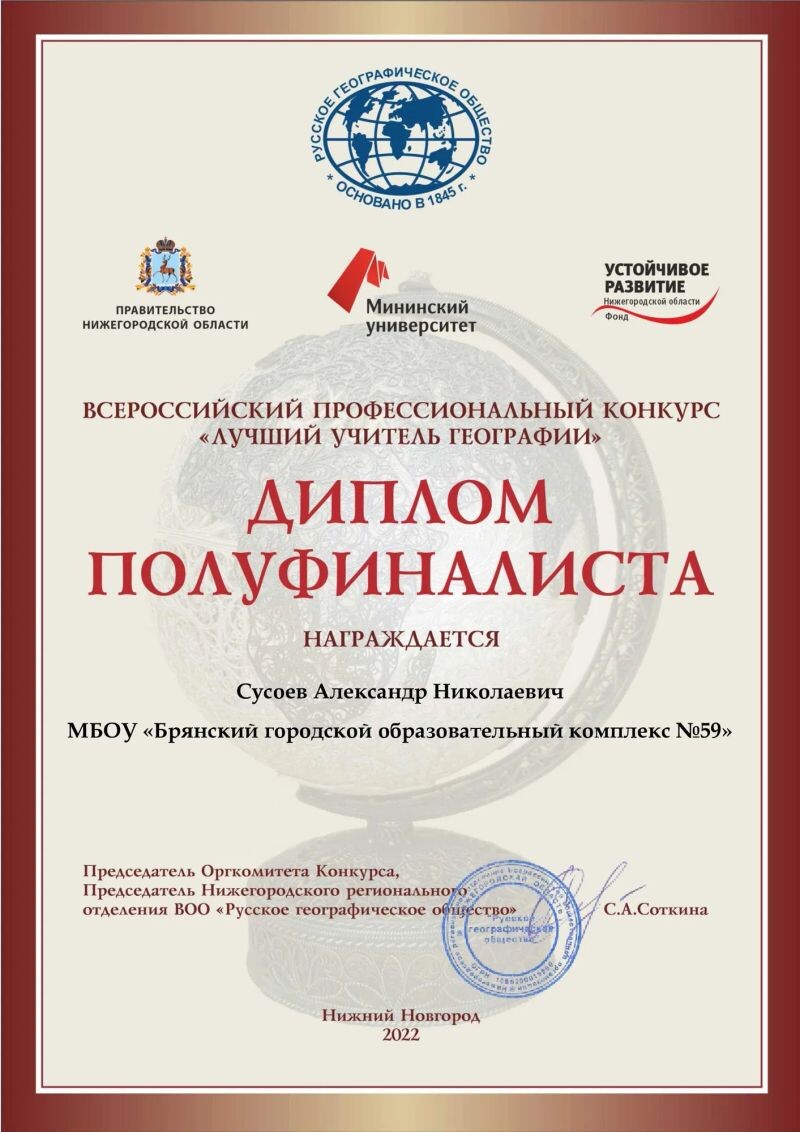 - Всероссийский профессиональный конкурс «Лучший учитель географии», диплом полуфиналиста, 2022 г.