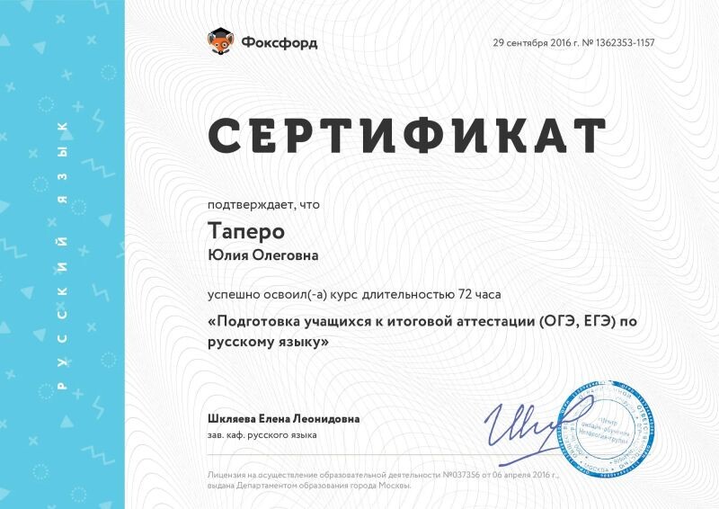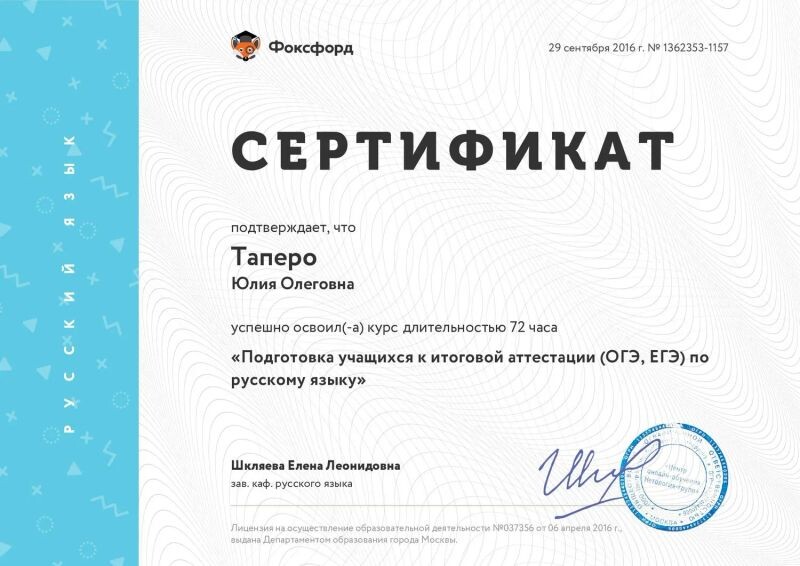 - ООО «Фоксфорд», курс «Подготовка учащихся к итоговой аттестации (ОГЭ, ЕГЭ) по русскому языку», 2016 г.