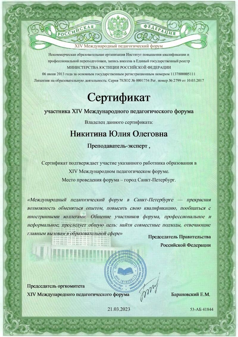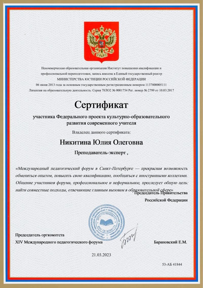 - Сертификат участника XIV Международного педагогического форума, 2023 г.