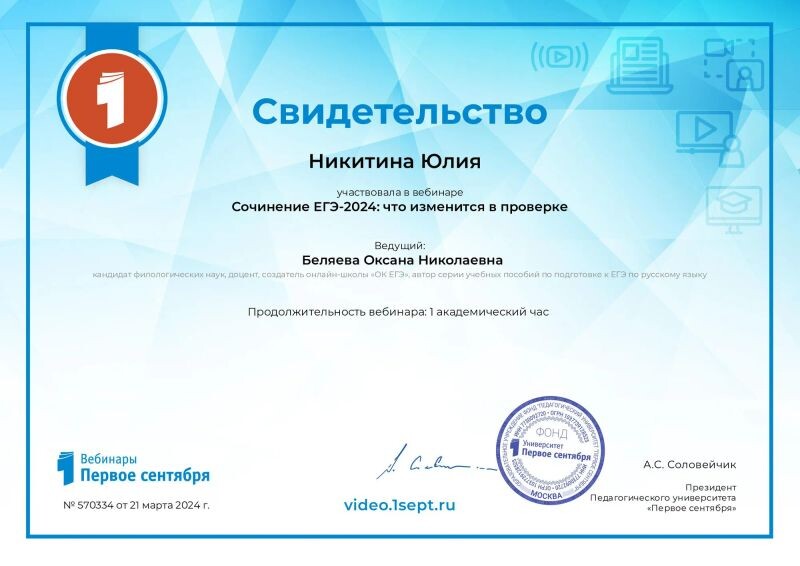 - Педагогический университет «Первое сентября», вебинар «Сочинение ЕГЭ-2024: что изменится в проверке».