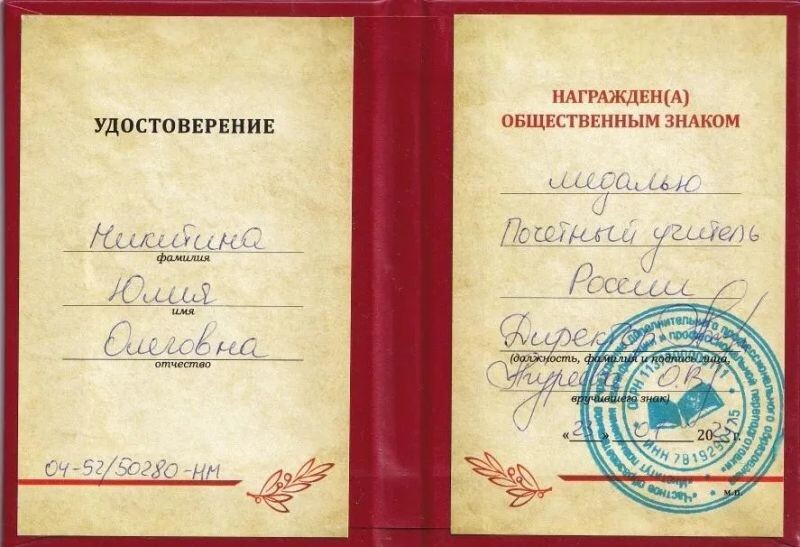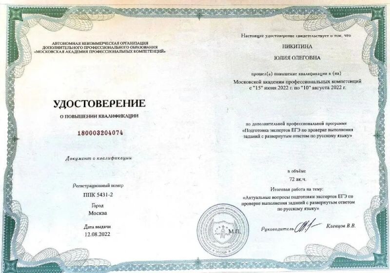 - Удостоверение эксперта ЕГЭ (с 2022 г.).