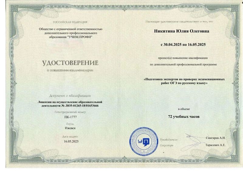 - АНО ДПО «УЧИМ.ПРОФИ», подготовка экспертов по проверке экзаменационных работ ОГЭ по русскому языку, 2025 г.