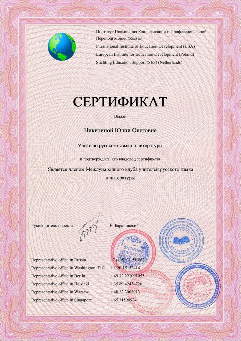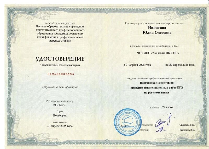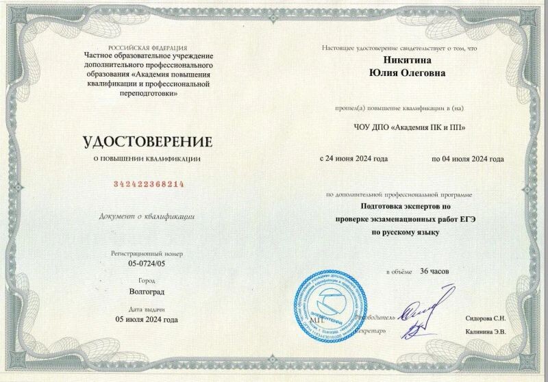 - ЧОУ ДПО «Академия повышения квалификации и профессиональной переподготовки», программа «Подготовка экспертов по проверке экзаменационных работ ЕГЭ по русскому языку», 2024 г.