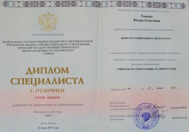 - Брянский государственный университет им. академика И.Г. Петровского, русский язык и литература, учитель русского языка и литературы, 2010–2015 гг.