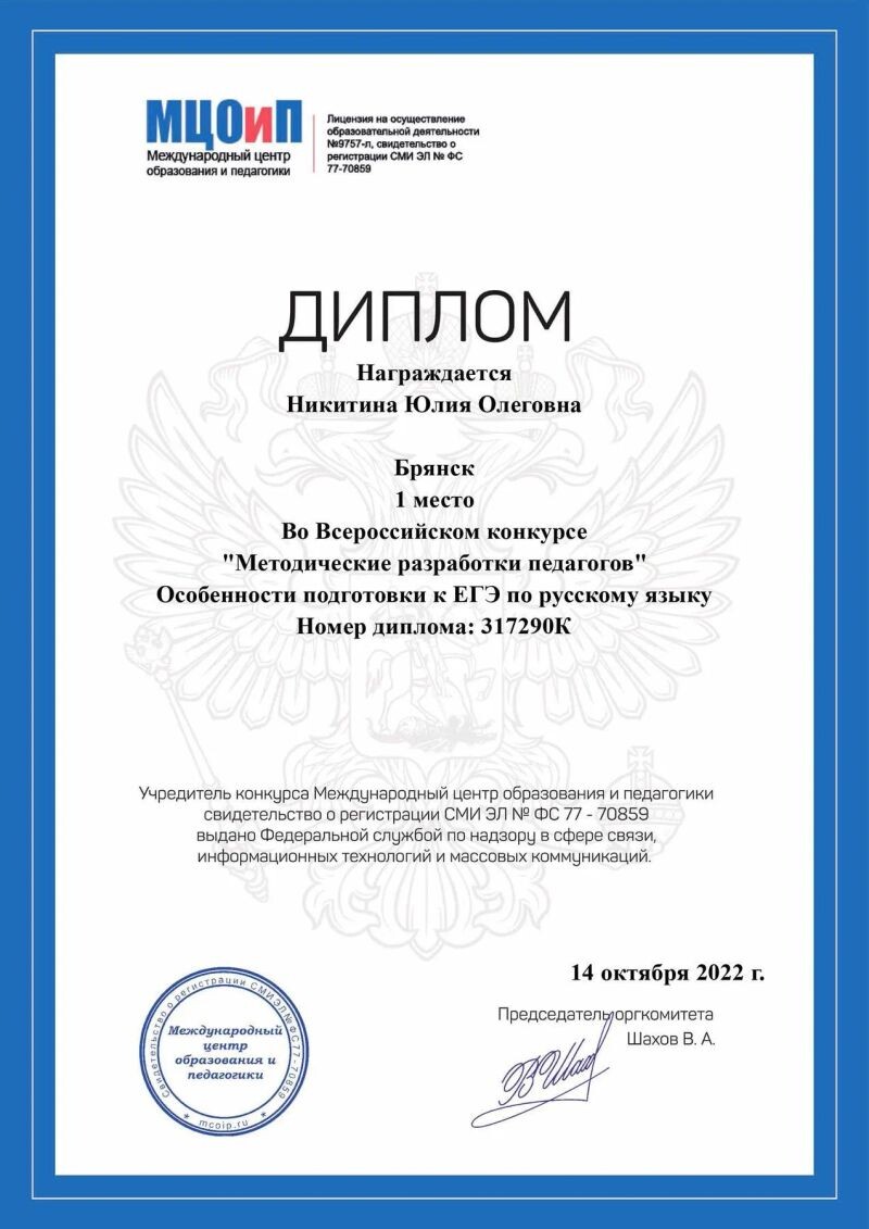 - I место во Всероссийском конкурсе «Методические разработки педагогов», 2022 г.