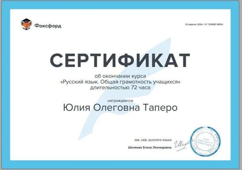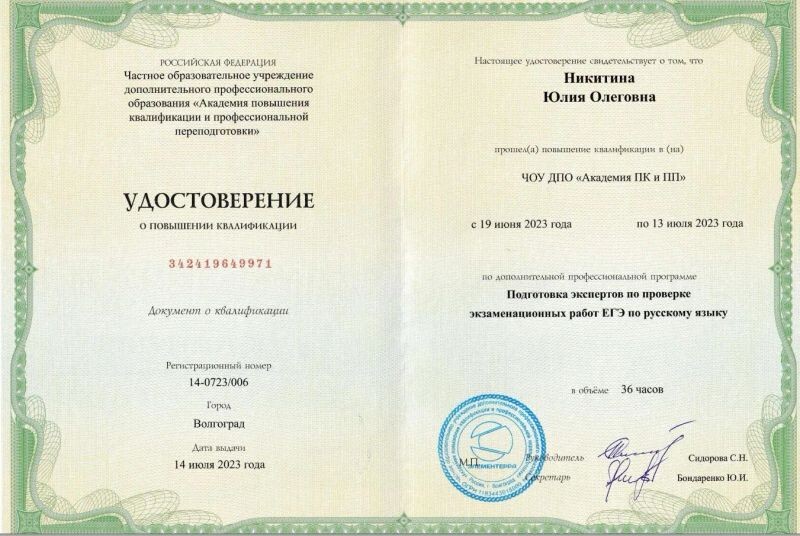 - ЧОУ ДПО «Академия повышения квалификации и профессиональной переподготовки», программа «Подготовка экспертов по проверке экзаменационных работ ЕГЭ по русскому языку», 2023 г.