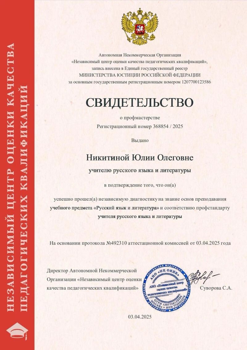- Независимый центр оценки качества педагогических квалификаций. Свидетельство о профмастерстве (с 2025 г.).