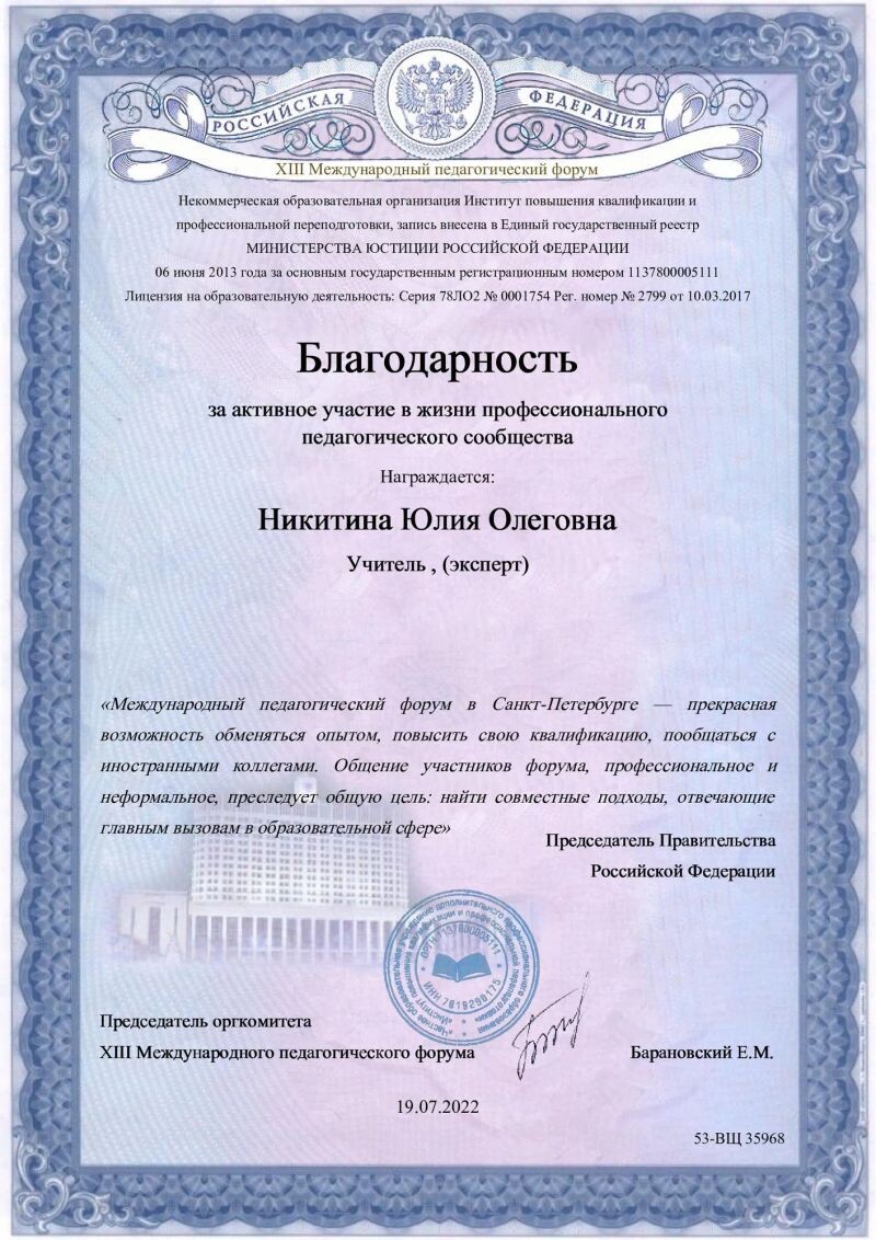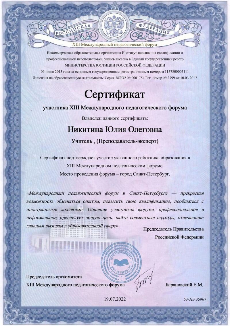 - Сертификат участника XIII Международного педагогического форума, 2022 г.