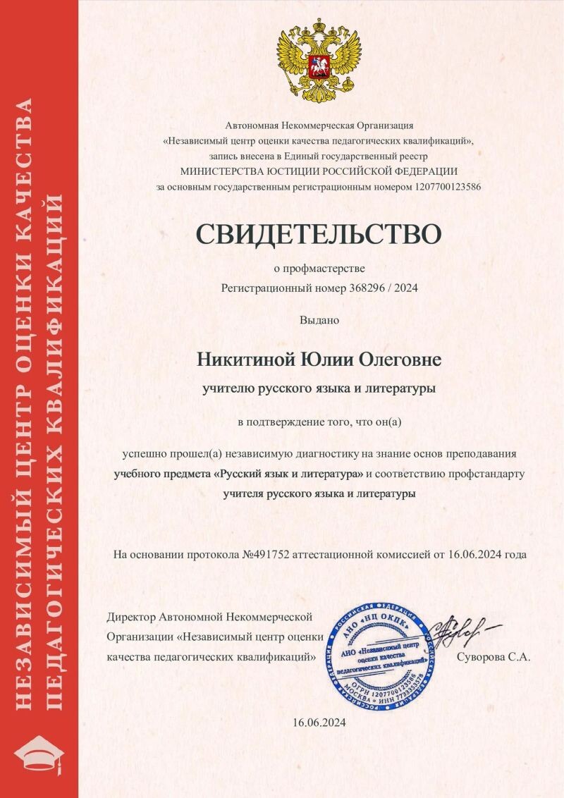 - Независимый центр оценки качества педагогических квалификаций, свидетельство о профмастерстве, 2024 г.