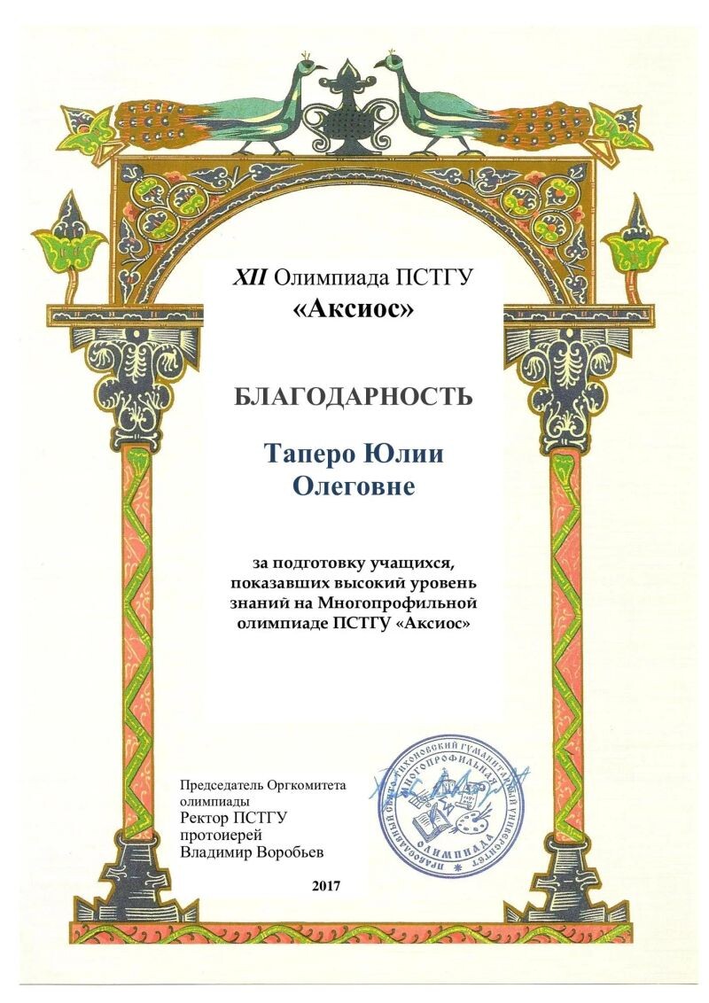 - Благодарность за подготовку учащихся к ХІІ Олимпиаде ПСТГУ «Аксиос», 2017 г.
