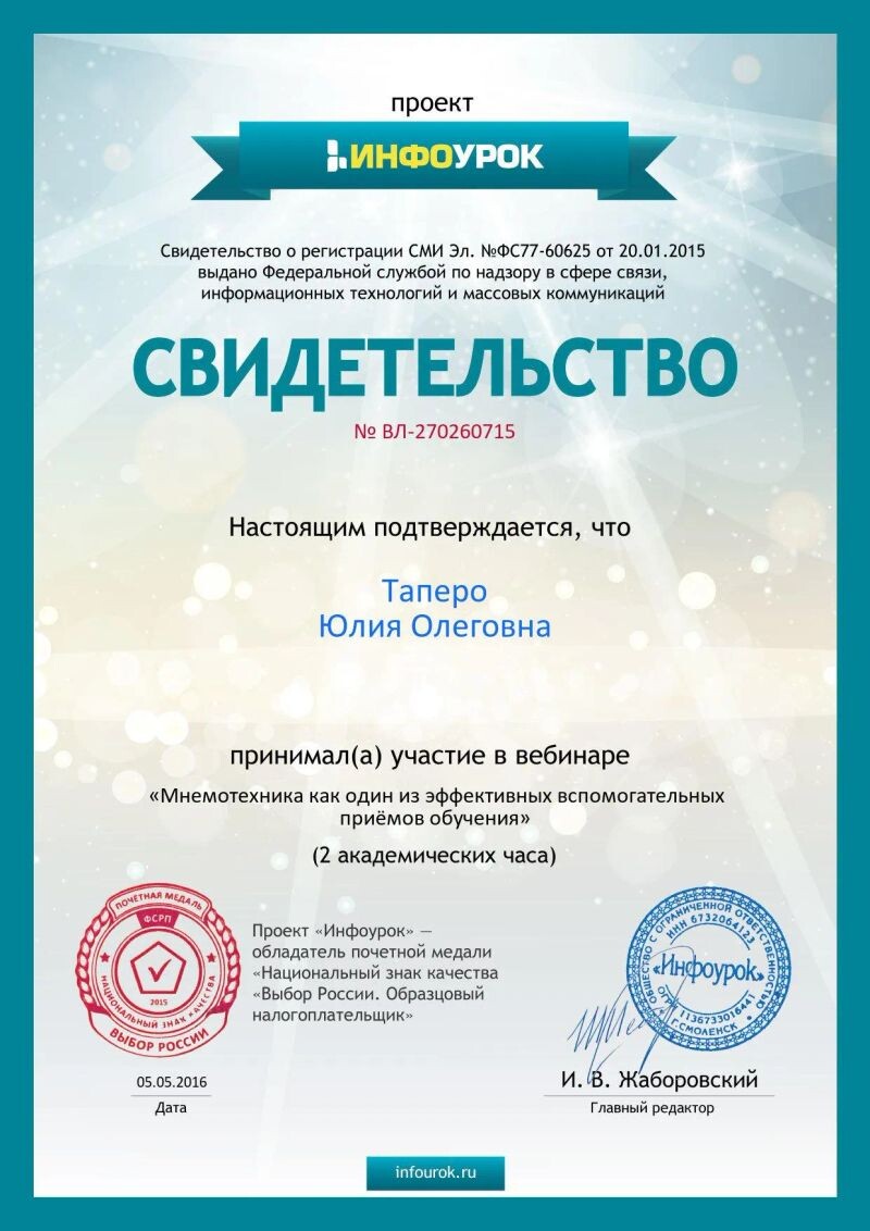 - ООО «Инфоурок», вебинар «Мнемотехника как один из эффективных вспомогательных приёмов обучения», 2016 г.