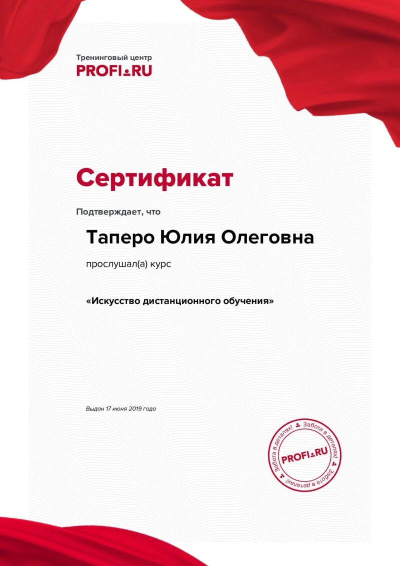 - Тренинговый центр Профи, курс «Искусство дистанционного обучения», 2019 г.